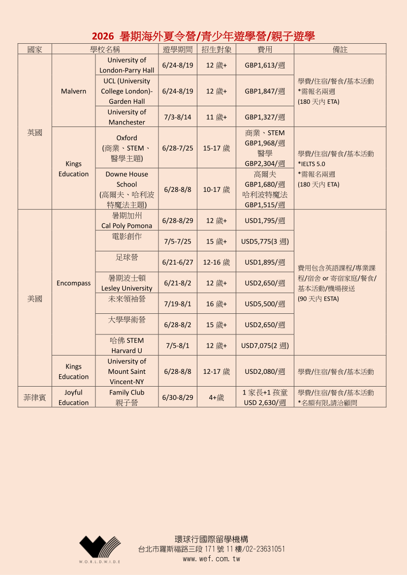 各類遊學活動 » 2026暑假海外夏令營,青少年+親子總表_02